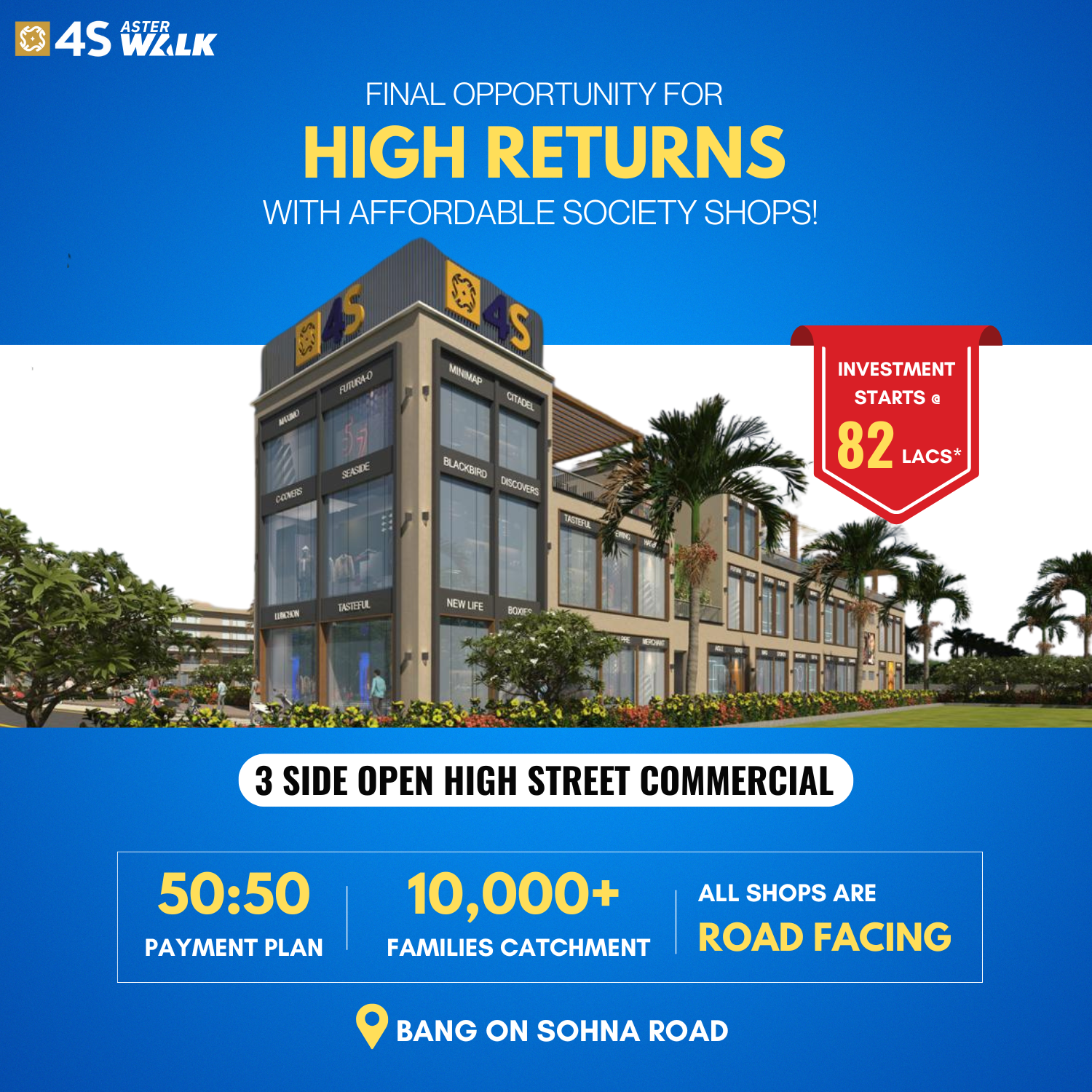 With Variety of amenities and low maintenance, 4S Aster Walk Society Shops provide a major focus on growth. Whether it’s daily essentials or life shopping, Aster Walk offers an variety of stores, making it a perfect spot for rest, entertainment, and convenience.