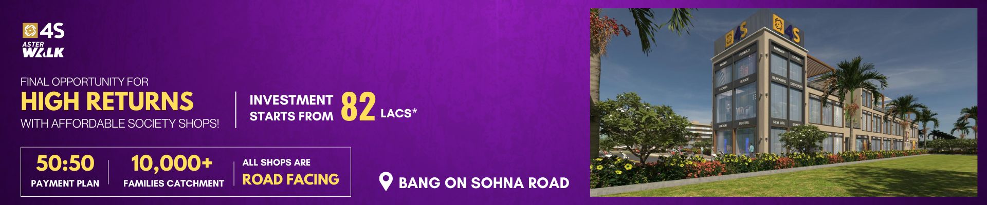 Surrounded by low- rise domestic complexes, 4S Aster Walk in Sector 36 Sohna Gurgaon caters to a growing community of discerning buyers and residents. This makes it an excellent choice for entrepreneurs looking to establish businesses that meet the daily requirements of original residents.